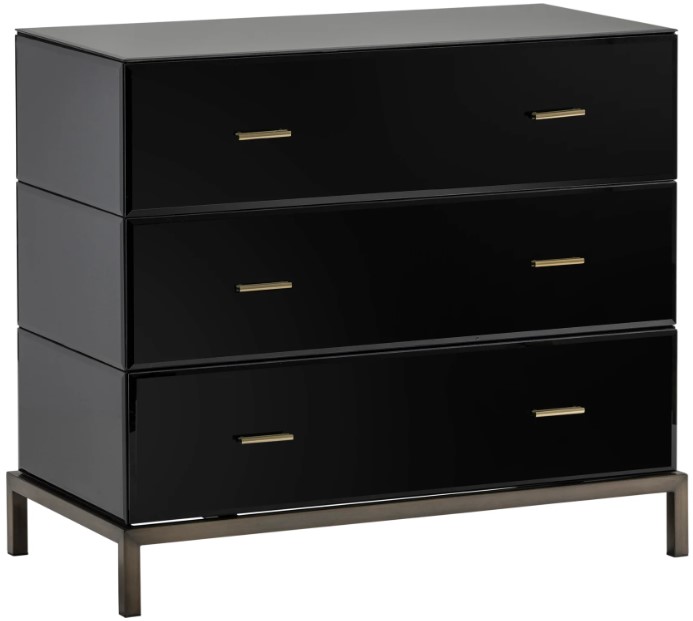 This contemporary chest from Crestview features a 3 glass drawers shown in black finish with gold finish handles and metal legs. Perfect addition to your bedroom and can fit perfectly with other furniture models.Read More