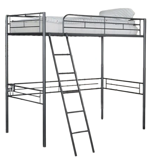 The Furniture of America® Myles Black Twin Loft Bed features a sleek, modern design with a sturdy metal frame. Its elevated structure maximizes space beneath, offering extra storage or a workspace, making it perfect for small bedrooms or dorms.Read More