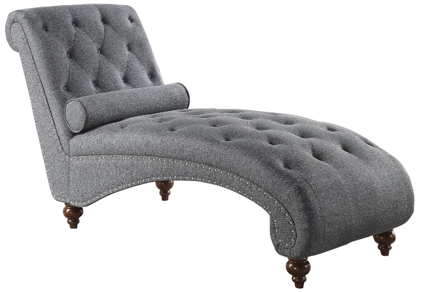 Your preference for modern traditional styling and comfort intersect in the design of the Bonne Collection. Contoured for your ultimate comfort and trimmed with traditional accents, the timeless look will be a wonderful addition to your boudoir or living room. The gray fabric covered chaise features button tufting, rolled bolster pillow, nailhead trim and espresso-finished turned wood legs. Also offered in brown.