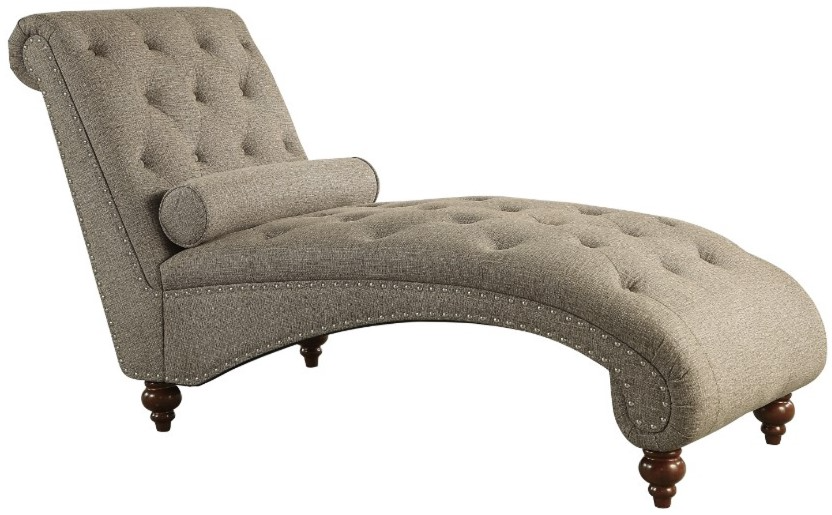 Your preference for modern traditional styling and comfort intersect in the design of the Bonne Collection. Contoured for your ultimate comfort and trimmed with traditional accents, the timeless look will be a wonderful addition to your boudoir or living room. The brown fabric covered chaise features button tufting, rolled bolster pillow, nailhead trim and espresso-finished turned wood legs. Also offered in gray.