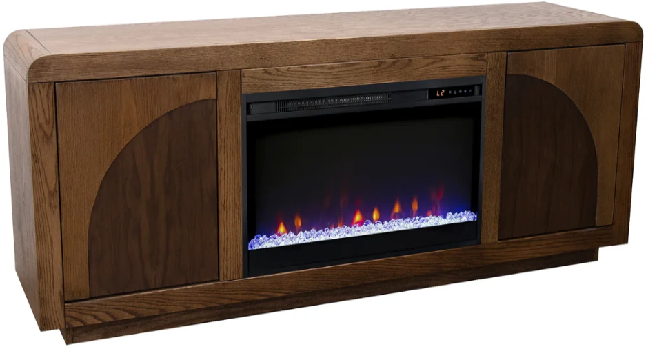 Bring home the eclipse 65 inch fireplace tv stand for sophisticated reimagined vintage style. Beautifully crafted from oak solids and veneers and walnut veneers, this entertainment center with fireplace rests atop a crisp plinth base and features striking two-tone finish inlay arch panels on the doors that mirror the curves of the top corners.Read More